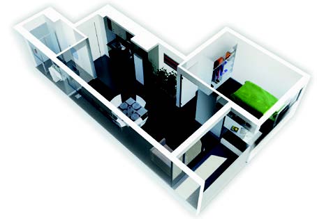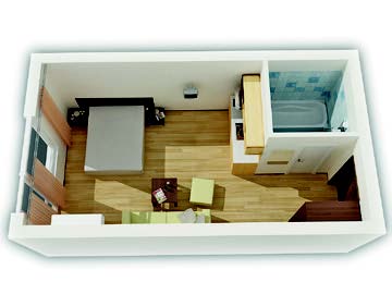 - Апартамент с 1 спальней - состоит из 2х комнат: гостиная, совмещенная с кухней, и